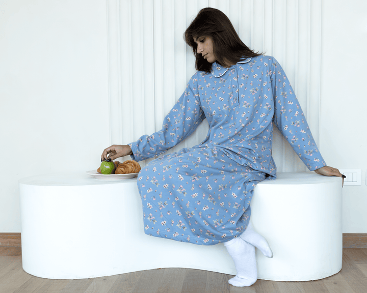Stay warm and snug in this ultra-soft fleece night gown. Designed with a relaxed fit, long sleeves, and a front button closure, it’s ideal for lounging or sleeping on chilly nights.