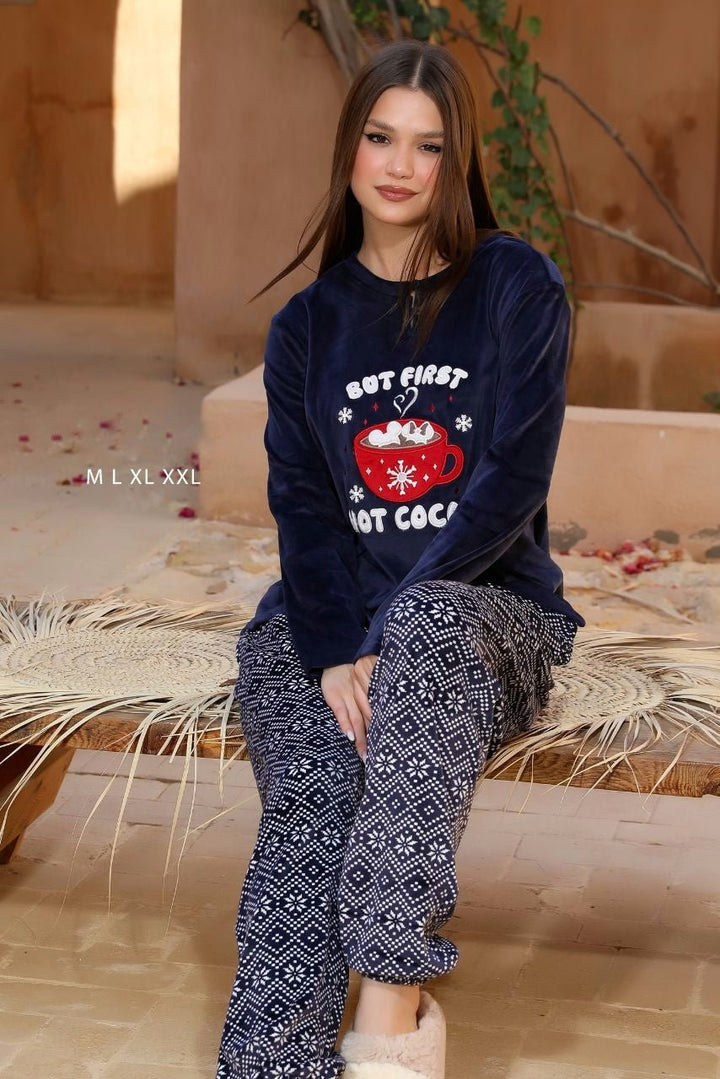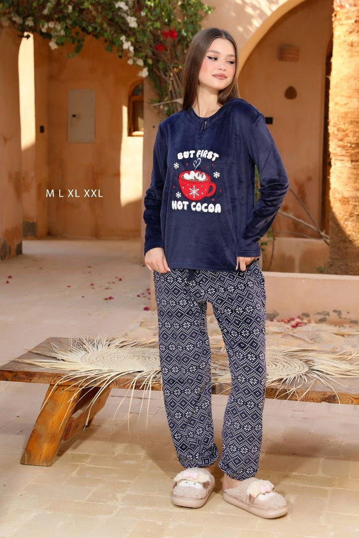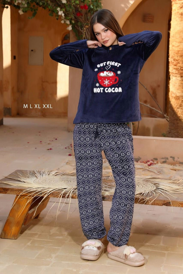 استمتعي بأقصى درجات الراحة والدفء مع هذه البيجامة الشتوية الرائعة المصنوعة من **خامة القطيفة الناعمة الفاخرة**. تتميز بتصميم أنثوي لطيف ، لتمنحك مظهرًا مرحًا وجميلًا في أوقات الاسترخاء بالمنزل
