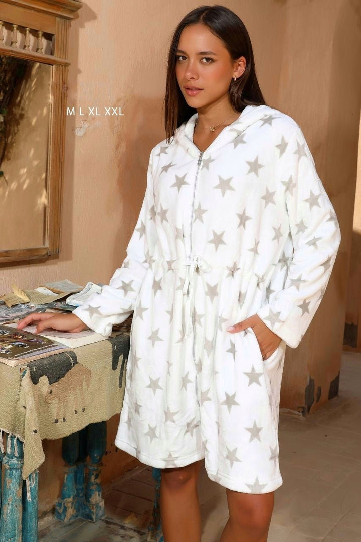 استمتعي بأقصى درجات الراحة والأناقة مع النايت شيرت الشتوي الأنيق المصنوع من خامة القطيفة الناعمة . يتميز بلونه الأبيض المزيّن بنقشة النجوم الرمادية لإطلالة ناعمة ومشرقة تمنحك شعورًا بالدفء والأنوثة في نفس الوقت.